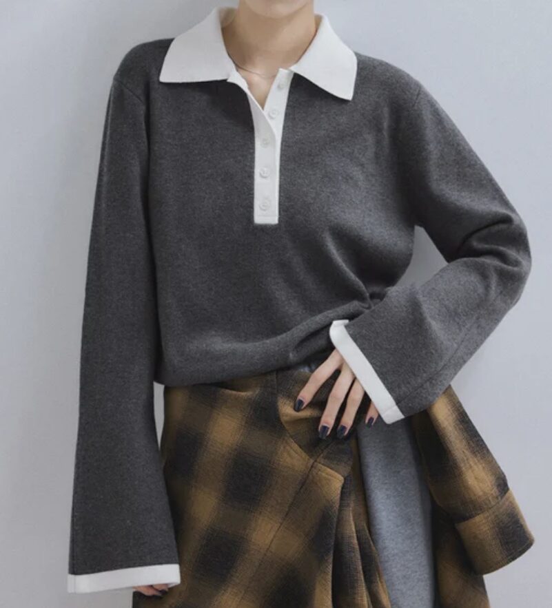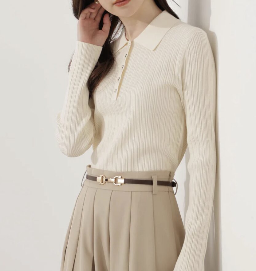 ポロシャツタイプや大きめの衿は、視線を自然と顔周り(上)に集め、スッキリとした印象に。