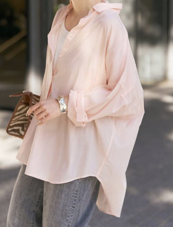 甘さを程よく抑えるのが大人流です。 ネイビーのパンツやグレーのタイトスカート、あるいはいつものデニムに合わせてみてください。反対色や辛口なアイテムを添えることで、パステルの華やかさが品よく引き立ちます。