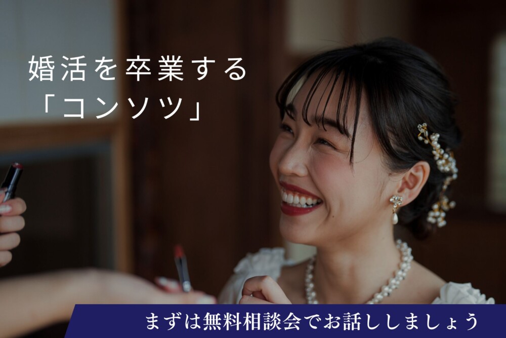 さきほど紹介したコンソツメンバーの声にも書いてあるように、選ばれる自分になるためには婚活の場に行くこともそうですが、「自分の人生と向き合い、見た目も心も磨いて選ばれる自分になる」ことが何より必要不可欠なのです。私、そしてコンソツメンバーと同じように、自分らしさを制限されることなく、豊かであならたしく幸せになれる結婚は必ずあります。それを見つけ、叶えるのがコンソツです。